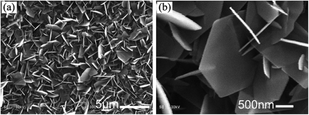The image shows an SEM image of HA crystals on PA matrix in phosphate solution a) low-magnification b) high-magnification.