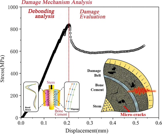 The image shows a Stress vs Displacement graph of damage and debonding of bone cement.