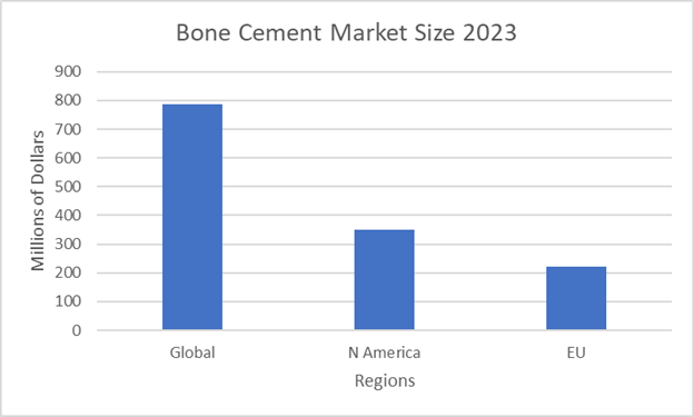 In 2023, the global bone cement market was $786.1 million.5 Over the next decade, it is estimated that the industry and market will grow at a CAGR rate of more than 3%.5 North America had a market share of $349 million and the EU had a market of $221.8 million in 2023.19–21