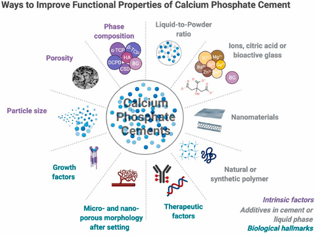 This image shows a brief overview of the improvement approaches for calcium phosphate cements.