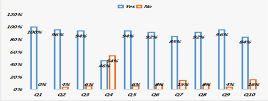 Table 2 & graph 1 presented questionnaire results for immunization-campaign reaction of Saudi Arabia citizens and residents during first six months of Coronavirus vaccine existence, it was submitted via websites and the result was received in terms of the number of participants suitable for the research. It was found from the first question was “Citizen or resident in KSA?”; showed all participants were 100% citizens and residents of KSA, and this showed the importance of the research topic in the KSA societal immunity.1–2 The second question was “Agree for Coronavirus vaccine existence in KSA?”; that was indicated nearly 96% of participants agreed that the Coronavirus vaccine exists in KSA, and it was started given to the KSA societal immunity that was approved from WHO for KSA, as well immunization-campaign was started at 17/12/2020 including citizens and residents.1–2 The third question was “Feeling protected from Coronavirus infections after the vaccine availability KSA?”; 94% of the participants was explained the extent to which they feel protected from Coronavirus infections with the Coronavirus infections as a result of taking the Coronavirus vaccine, which protected individuals with a societal immunity and healthy protection from the Coronavirus infections.3–4 As for the fourth question was “Received Coronavirus vaccine in KSA?”; it was cleared that 46%, about half of answered persons, had received the Coronavirus vaccine. That because the “Ministry of Health” systematized according to the age groups to administer the Coronavirus vaccine, and the number had reached almost half of residents and citizens.5–8 The fifth question was “Confirm the Coronavirus vaccine should be taken for all individuals in KSA?”; that was clarified the extent of the emphasis on taking the Coronavirus vaccine and it was about 94% of all. That which explained the importance of the Coronavirus vaccine for societal immunity and health protection and reducing Coronavirus infections in the KSA society.5–8 The sixth question was “Urged to take Coronavirus vaccine for individuals refusing in KSA?”; was clarified that 92% of the participants urged those who refuse the Coronavirus vaccine to take it to protect the individuals health and societal immunity, reduce Coronavirus infections, and maintain the KSA societal immunity and society health.3–4 The seventh question was “There is an improvement societal immunity situation after the presence of Coronavirus vaccine in KSA?”; was clarified that 85%, or more than three quarters, found an improvement in the KSA societal immunity and health status of society during the first six months of the Coronavirus vaccine in the KSA society. This was evidence of the effectiveness of the Coronavirus vaccine in the performance societal immunity and societal immunity for individuals health protection and KSA society.9,10 The eighth question was “Supports the adoption of the Coronavirus vaccine system in KSA?”; that was found about 92% of all helped to follow the societal immunity and health regulations of the Coronavirus vaccine through advertisements, societal immunity and health programs, and also by dealing with members of health centers and the health sector in KSA, and this encouraged individuals to take the Coronavirus vaccine in an easy and accessible way.5–8 The ninth question was “Confirms the continuation of “Precautionary Health Strategy” with Coronavirus vaccine period in KSA?”; was identified 96% who were close to everyone. They confirmed the continuation of societal immunity and health precautions during the Coronavirus vaccine in vaccination period, as the Coronavirus vaccine works to produce antibodies within 15 days of taking the Coronavirus vaccine. So it had despite this they emphasized the measures strongly even for the individuals who took the Coronavirus vaccine because there were no new Coronavirus infections cases and reduce the occurrence of Coronavirus infections during gatherings or in the markets or family parties and others.8,11 It was found from the tenth question was “Want to follow the Coronavirus vaccine plan in other countries?”; that more than three-quarters of 84% was affirmed that the Coronavirus system should be pursued in other countries in order to reduce Coronavirus infections. Also restore businesses and others to their normal course to compensate for the losses incurred in KSA society and other countries during the period of high Coronavirus infections and the closure of commercial routes and others.5–8 That found through the participants the reaction was clear during the first six months of the Coronavirus vaccine in the KSA society, and the greater purpose was medical protection for individuals, reducing Coronavirus infections, protecting societal immunity for KSA society, returning life to normal, compensation and reducing material losses.9-10