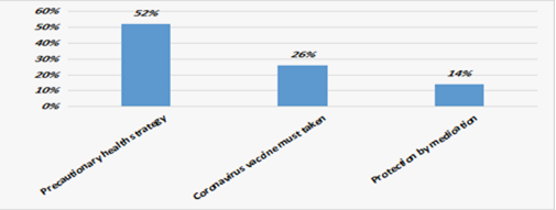 Table 3 & graph 2 presented advice results for immunization-campaign reaction of Saudi Arabia citizens and residents during first six months of Coronavirus vaccine existence, that was approved from WHO for KSA, as well as immunization-campaign was started at 17/12/2020, it was found through the eleventh question was “Can you help us with advice during the period of Coronavirus vaccine in KSA”; for advice from the participating individuals, the highest advice was by more than half of the participants, 52% advising to follow “Precautionary Health Strategy”. That such as washing hands well, using disinfectants, wearing a mask, not gathering and personal distancing, when there is a rise in temperature, you should go to the hospital or health center. Also not to hold celebrations or gatherings, not to crowd the markets, and to make personal and social distancing.8,11 The average advice was from more than a quarter of 26% who was recommended the Coronavirus vaccine must taken to protect the individual and the KSA society.3,4 The lowest advice was 14%, which was protection by medication or therapeutic supplements such as vitamins.3,4 All the advice were good, but the less advice as well you should consult a Specialized Doctor in treatment and supplementation for the individual, as each individual differs from the other with societal immunity status.8,11 Through the questionnaire was conducted for the research, it was found that the Coronavirus vaccine was of societal immunity importance to the individual and society health. Through the interaction of the participants in the questions and advice, and the precautionary societal immunity conditions must be followed for all individuals to help reduce Coronavirus infections, enhance the societal KSA society societal immunity and strengthen of individuals status societal immunity. Thus, that are able to return to our normal life and could reduce the various losses of individuals and KSA society.3,4,8,11