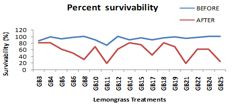 There has been a general mortality (Figure 2(a&b) in each and every treatment of the trial. By and large every treatment suffered from the havoc caused by rodents and reptiles (Figure 3(a&b). Student’s paired sampled two tailed t-test for the trait percent survivability exhibited highly significant (6.842**) value (Table 2) demonstrating higher mortality was prevalent during the pandemic lockdown. Further introspection confirmed that the lemongrass treatment GB21 suffered the highest mortality (75.94%), followed by treatment GB25 (75% mortality) and treatment GB8 (68.75% mortality). The treatment GB11 (variety CKP25 developed by CSIR-IIIM, Jammu) also had its alarming share of mortality represented by 54.46% (Figure 4(a&b) & Figure 5). The treatment GB6 (variety Krishna developed by CSIR-CIMAP, Bangalore) and treatment GB17 (variety Kalam developed by CSIR-IIIM, Jammu) exhibited almost equal mortality (46.43% and 46.23%, respectively) during the pandemic lockdown. The least affected lemongrass treatment was GB3 (variety Chirharit developed by CSIR-CIMAP, Lucknow) having 5.96% mortality followed by treatment GB14 with 7.64% mortality and treatment GB18 (variety Pragati developed by CSIR-CIMAP, Lucknow) with 13.67% mortality. The treatment GB4 (variety JorLab2 developed by CSIR- NEIST, Jorhat) had 17.29% mortality. So, the results clearly indicate that among the improved varieties of lemongrass released so far, variety CKP25 with highest mortality(54.46%) was drastically affected due to lack of care during the lockdown, while the frost resistant variety Chirharit (developed through clonal selection) was practically unharmed with least mortality (5.96%) growing in the same condition during lockdown. Thus, Chirharit which was released as a variety in 2001 developed by CSIR-CIMAP, Lucknow came out to be the most robust lemongrass variety which had tolerated all kinds of unfavourable conditions for a year and yet exhibited maximum survivability.