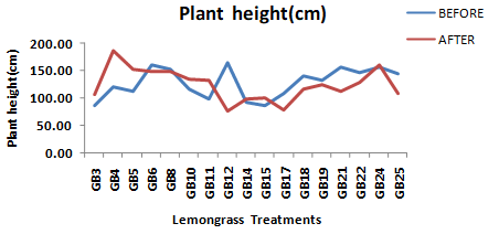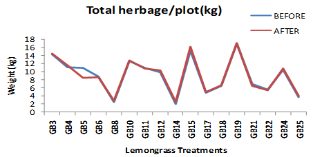 Mortality in the treatments should have had direct impact on the total herbage content in a plot because reduction in the number of plants in a treatment would lead to the reduction in the overall herbage of the same treatment in the plot. During the pandemic lockdown no harvest was carried out at all and so the individual plants per treatment in each replication had grown for a year. Therefore, the effect of mortality in treatments and loss of herbage due to mortality was compensated with the full herbage growth of the remaining surviving plants of the same treatment. This was clearly exhibited by the Student’s paired sampled two tailed t-test for the trait total herbage/plot(kg) having no significant difference (0.031) value (Table 2) demonstrating loss in biomass due to mortality was compensated by yearlong growth of the surviving plants per treatments. This compensation was best exhibited in the lemongrass treatment GB15 (variety RRL16 developed by CSIR-IIIM, Jammu) followed by treatment GB12 (variety CF100 developed by CSIR-IIIM, Jammu), treatment GB14, treatment GB4 (variety JorLab2 developed by CSIR- NEIST, Jorhat) and by the treatment GB24. The results clearly indicate that the variety RRL16 developed by CSIR-IIIM Jammu has the power of overcome the loss of herbage due to mortality if it can be left for prolonged growth and delay in harvest (Figure 6).