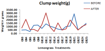Prior to lockdown, the treatments in the trial used to be harvested every third month in order to get best quantity of fresh young herbage and maximum essential oil. However, this process could not be followed during lockdown and the treatments were due with four harvests. Therefore, accumulations of the herb-growth lead to enormous mean clump weight per treatment in the trial. This was clearly exhibited by the Student’s paired sampled two tailed t-test for the trait clump weight(g) having no significant difference (-0.426) value (Table 2) demonstrating gain in the mean clump weight was a uniform event in the treatments during lockdown. This was best exhibited by GB11(variety CKP25 developed by CSIR-IIIM, Jammu) followed by GB4 (variety JorLab2 developed by CSIR- NEIST, Jorhat) and GB15 (variety RRL16 developed by CSIR-IIIM Jammu). The results clearly indicate that among the released lemongrass varieties, CKP25 developed by CSIR-IIIM Jammu will have the highest mean clump weight if it is left unharvested for even a year (Figure 7).