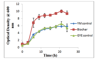 Figure 1A cerevisiae growth in YM medium (21g/l), Biochar medium (20g/l glucose, 10g/l yeast extract, 2 g/l PLB), GYE medium (20g/l glucose, 10g/l yeast extract.