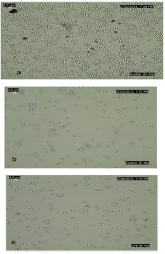 Figure 2 Microscopic slides of S. cerevisiae aerobic growth at 9 hours in biochar and controls media (a) biochar, (b) YM control, and (c) GYE control.