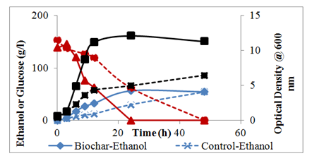 Figure 3 S. cerevisiae growth under anaerobic condition in the GYE control (150g/l glucose, 10g/l yeast extract), and biochar medium (150g/l glucose, 10g/l yeast extract, 2g/l biochar).