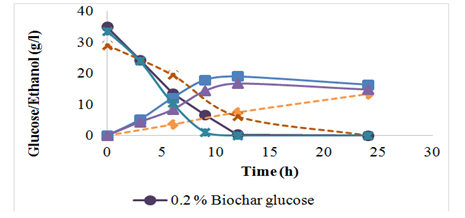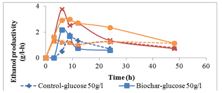Figure 5 Ethanol productivity by S. cerevisiae from glucose fermentation for controls (no biochar) and 0.2% biochar addition.