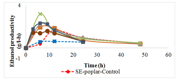 The maximum ethanol productivities obtained for the 1% PLB loading in the case of SEP and SECS were 2.26g/l-h and 2.02g/l-h respectively, and they both occurred at the same time (6 hours). However, the maximum ethanol productivity for 0.2 % PLB loading occurred at different times and were 1.6g/l-h at 9 hours for SECS versus 1.94g/l-h at 6 hours for SEP (Figure 6). The shorter ethanol production time observed in the case of SEP may be due to the fact that the biomass was washed with water after steam explosion pretreatment while the SECS was not washed. Studies have shown that washing the biomass with water after steam explosion pretreatment removed some inhibitory compounds,26 which can explain the overall increase in ethanol production from poplar compared to corn stover.