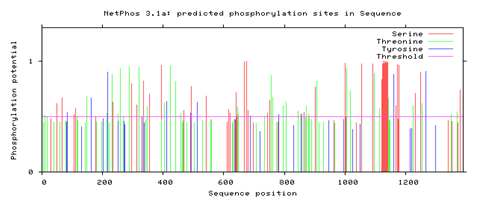 Phosphorylation site has been located in the NetPhosK 3.1L Server. Different kinases like CAM-GSK3, CKII, cdc2, CK1, DNAPK, p38MAPK, PKG, ATM, RSK, PKA, cdk5, PKA, cdk5, PKB and UNSP have been found to be involved in the phosphorylation of protein. Highest score was predicted for the site 0.908 having serine residue. After analysis, % composition of amino acids has been obtained and is shown in Figure 5.