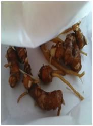 When adult mosquitoes were tested against repellent activity, although K. galanga rhizome powder does not kill the adult mosquitoes, their mobility has been affected. They rest on the net of the cage after 25-30 minutes (Figure 2A & 2B). Extracts of K. galanga causes central nervous system depression, a decrease in motor activity and a decrease in respiratory rate.15 When the rhizome powder from natural plants and tissue cultured plants alone was tested in two concentrations for mosquito repellent activity, the mobility for naturally grown plants showed the distance of 24.16± 0.94, 28.31± 1.25 while tissue cultured plants showed mosquito harboring in 32.49± 0.5, 31.54± 0.54 distance respectively for 1.0 g and 2.0 g. No significant different was observed when the dry rhizome powder used as a mixture (0.75:0.25) or along (1.0 g) indicating the use of low amount of rhizome powder is also possible to repel the mosquitoes. Literature survey revealed that there are very less reports on neuro pharmacological activity of this plant. In the sedative activity study, extracts exhibited significant reduction of locomotor and exploratory activities in Swiss albino mice. Results of the study with Swiss albino mice indicated that all tested doses (100 and 200 mg/kg) of different extracts of K. galanga exhibited significant sedative effect. The effect is dose dependent, long lasting and statistically significant.15 Hexane extract of the rhizome has been used to test the mosquito repellent activity.16 The results of this preliminary study could be used in developing a commercial herbal powder to use as a mosquito repellent for mosquito species namely- A.aegypti, A. albopictus, Culex sp. and Armigerous sp.-using a suitable base instead of starch which is more convenient and cost effective.