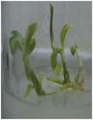 Root induction of in vitro shoots: For root induction, elongated in vitro shoots (≥3.0 cm)were either continuously sub-cultured in the same medium or separated after 3 weeks and cultured in MS medium supplemented with IBA (0.0 -1.0 mg/L) and 1.0 mg/L IAA. The jelly moss level was decreased to 7.0 g/L. Number of roots produced and length of the roots were recorded weekly over a period of 4 weeks.