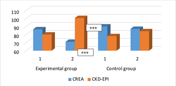 Figure 1 Dynamics of CREA (mmol/l) and CKD-EPI (ml/min) during the experiment (1 and 2 tests).