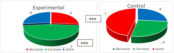 As we see for 10 people in experimental group Balance L improved, while for 5 people it was the same and very high. In control group it decreased for 7 people, increased for 2, and was the same for 5 people. It is important to note that this index is correlated with sympathetic activity of the autonomic nervous system, and its increase in experimental group signifies decrease of sympathetic activity and increase of organs balance. For people with high balance it did not change, while for people with low balance it increased. This is reflection of growth of adaptive and energetic potential of the organism, as well as recovery after loads. In control group for 7 participants we see the opposite effect. For Area parameter it was no difference between experimental and control groups.