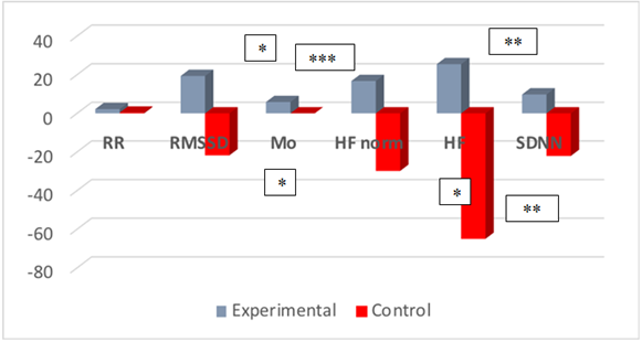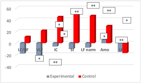 Figure 3 Percentage of change in rhythmogram indicators, the increase in which reflects the increase in adaptation and reserve capacity of the body.