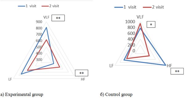 As we see from this figure, there is a clear opposite dynamics of indicators reflecting the decrease in adaptation of the organism in the control group, which may be explained by the effect of the adverse epidemiological, climatic and seasonal period - and the decrease of indicators in the experimental group due to the protective effect of Amezcua disc water. Figure 5 reflects the dynamics of the spectral parameters of the heart rhythm of the two groups. The figures clearly demonstrate the growth of parasympathetic regulation and central control in the experimental group. It also reflects the above described tendencies of adaptation potential of the subjects.
