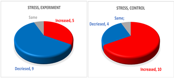 For Control group no difference was found between two measurements. For Experimental group changes for the following parameters was found (Figures 6–8): Stress Index; Organs Balance; Balance L. As we see, in experimental group for 9 people Stress index decreased, for 5 people it increased staying in the optimal zone, and for 1 person it was the same. In control group For 5 people Stress index increased, for 3 people decreased, while for 7 people stayed practically the same.