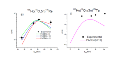 The measured excitation functions and the theoretical predictions obtained from PACE4 for 176Re residue populated via (16O, 5n) channel is shown in Figure 1a. Obviously in this channel, there is no likelihood of ICF reaction, and therefore, this channel is populated only by the CF process. It may be observed from Figure 1a that the theoretically calculated excitation functions for the level density parameter K = 12, in general, reproduced satisfactorily the experimentally measured excitation functions for the residue 178Re produced in the CF 16O projectile with 165Ho target. The fact that the measured CF cross-sections for a representative non-α-emitting (non-α-emit) channels in system, 16O + 165Ho, could be reproduced satisfactorily by PACE4 predictions, gives confidence in the input parameters chosen to fit the EFs of all other non -α and α- emitting channels considered in the , 16O + 165Ho system . Figure 1b displayed the measured cross-sections for the representative (16O, α3n) channel. Note that in the case of (16O, α3n) channels, the residues may be formed by two different processes: