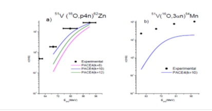 Figure 2 measured EFs for (16O, p4n) channels along with PACE4 predication and (b) alpha emitted channels for (16O,3αn)system.
