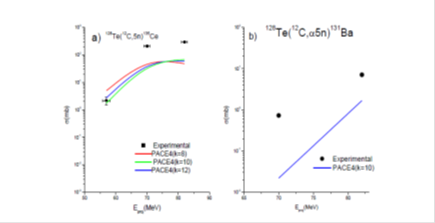In this system also values of the level density parameter (K=8, 10, 12), were varied to fit to the experimentally measured EFs for a representative non-α-emitting (12C, 5n) channel, in this channel also there is no likelihood of ICF reaction occurring and therefore, this channel is populated only by CF process. As can be seen from Figure 3a the PACE4 predication with K=10, in general, reproduced satisfactorily the experimentally measured EFs. For all possible channels in the interaction 12C+ 128Te system, all calculations and analysis were done consistently using K=10. The measured EFs along with the PACE4 prediction for representative residue populated via-α-emitting channel is shown in Figure 3b. A representative 131Ba residue may be populated through CF and/or ICF processes as: