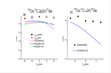 Values of the level density parameter (K= 8, 10, 12) were varied to fit to the experimentally measured EFs for a representative non-α- emitting channel, (12C, 2p2n) in this channel also there is no likelihood of ICF reaction occurring and therefore, this channel is populated only by CF process. As can be seen from this Figure 4a the PACE4 predication with K=10, in general, reproduced satisfactorily the experimentally measured EFs. For all other possible channels populated in the interaction 12C+ 59Co system, all calculations and analysis were done consistently using K=10. The measured EFs along with the PACE4 prediction for representative residue populated via α-emitting channel is shown in Figure 4b. A representative 65Ga residue may be populated through CF and/or ICF processes as: