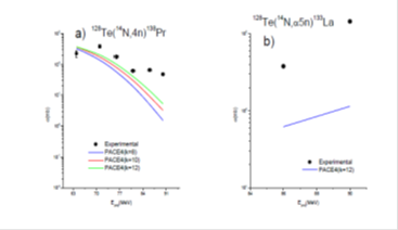 In4N + 128Te system the values of the level density parameter (K=8, 10, 12) were varied to fit to the experimentally measured EFs for a representative of-α emitting, (14N, 4n) channel. In this channel also there is no likelihood of ICF reaction occurring and therefore, this channel is populated only by CF process. As can be seen from this Figure 5a the PACE4 predication with K = 12, in general, reproduced satisfactorily the experimentally measured EFs. For all possible channels in the interaction 14N + 128Te system, all calculations and analysis were done consistently using K = 12. The measured EFs along with the PACE4 prediction for representative residue populated via α-emitting channel is shown in Figure 5b. A representative 133La residue may be populated through CF and/or ICF processes as: