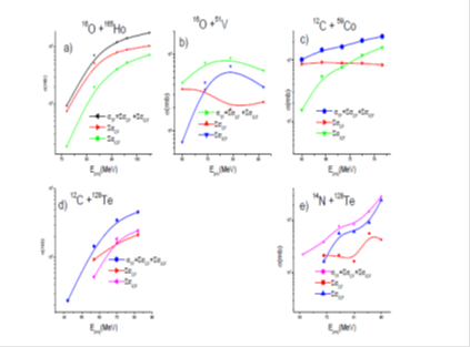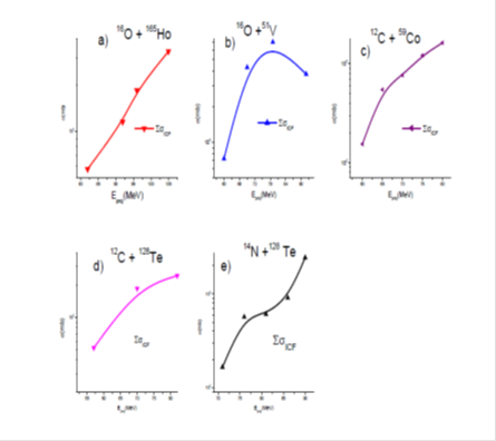 In this section, an attempt has been made to separate the contributions of ICF in all α-emitting channels populated in the interactions of a12C, 14N and 16O projectiles with59Co,128Te,51V and 165Ho targets. The sum of the ICF cross-section for the respective systems