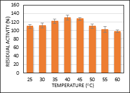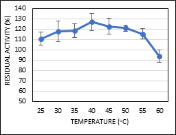 Optimum temperature experiments showed that MNP-CLEA-lipase can achieve a maximal activity at 40°C (127% RA), and still showed a high RA of above 90% at 60°C (Figure 1). Talekar et al.,10 & Nadar et al.,26 obtained the highest RA of MNP-CLEA-α-amylase and MNP-CLEA-glucoamylase, respectively, at 60°C with residual activities above 90%. In a research carried out by Safi and Yusof32, MNP-CLEA-lipase of skim latex with glutaraldehyde, achieved an optimum temperature of 35°C with 85.89% RA. Thus, MNP-CLEA-lipase with pectin showed more significantly higher RA at optimum temperature. This shows that MNP-CLEA-lipase can work at high temperatures, inferring the significant presence of covalent bonds between the lipase and the dialdehydic pectin during immobilization which decreases the conformational flexibility of lipase and protects it from distortion or damage at high temperature.10,26