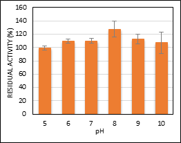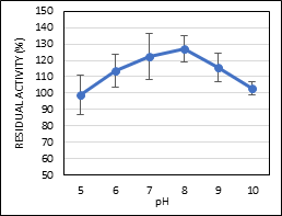 The optimum temperature and pH of MNP-CLEA-lipase was determined by incubating the enzyme at different temperatures and pH conditions. The optimum temperature obtained for MNP-CLEA-lipase is 40°C with 127% RA as shown in Figure 1. MNP-CLEA-lipase exhibited high RA even at high temperature, showing a RA above 90% at 60°C. As for the pH, the highest RA of MNP-CLEA-lipase was achieved at pH 8 with RA of 127% as shown in Figure 2. It is observed that MNP-CLEA-lipase maintains a high RA even at extreme pH conditions but is optimum at pH 8.