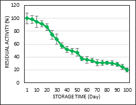 Storage stability was determined by storing MNP-CLEA-lipase in sodium acetate (NaCH3CO2) buffer (0.1 M, pH 5) without substrate at 4°C. Lipase enzyme activity assay was carried out every five days for 100 days.13 The RA of MNP-CLEA-lipase for Day 1 was set as 100%.