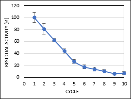 The enzyme reusability test for MNP-CLEA-lipase was done by recycling MNP-CLEA-lipase for 10 consecutive cycles. The assayed MNP-CLEA-lipase (first cycle) was washed and stored in 3 mL of water at 4°C for 24 h, whereby the assay was repeated nine more times. The RA was calculated by taking the enzyme activity of the first cycle as 100%.6