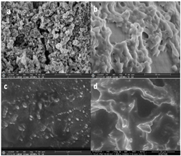 Field emission scanning electron microscopy (FESEM) is a technique to obtaining structural information on materials at nanometer-scale resolution.37 Energy-dispersive X-ray spectroscopy (EDX) determines the elemental composition of a specimen. FESEM and EDX are important aids in the determination of the relationship among catalyst particles (cluster) sizes, dispersion onto support, morphology, and the influence of promoters.38 FESEM provides imaging of features with high resolution and high contrast in the nanometer scale. Figures 7 show the FESEM images for (a) functionalized MNPs, (b) CLEA-lipase, (c) MNP-CLEA-lipase cross-linked with pectin and added soy protein, and (d) MNP-CLEA-lipase cross-linked with glutaraldehyde. The results showed that MNP-CLEA-lipase with pectin and soy protein appeared to be less structured but with lesser clumping. The addition of MNPs seems to give an improved modification to the structure of the immobilized lipase due to more sufficient cross-linking. The formation of clumps on the surface of the CLEAs should be avoided to ensure better mass transfer. From the FESEM images obtained, it can be said that dialdehydic pectin and soy protein additive works as a better cross-linker and additive for MNP-CLEA-lipase as the result showed improved structure which translates to lesser mass transfer resistance.
