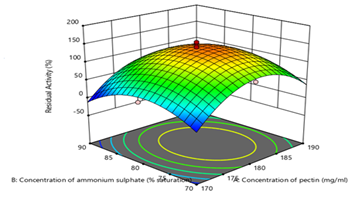 Figure 8 A Three-Dimensional Surface Plot for the Interaction of Concentration of Pectin and Concentration of (NH4)2SO4 by RSM using Design Expert® (Version 11) Software.