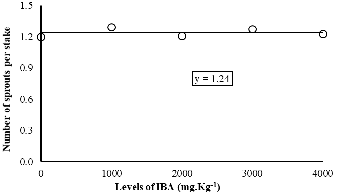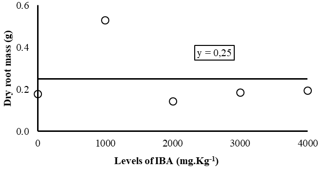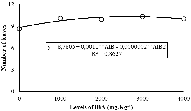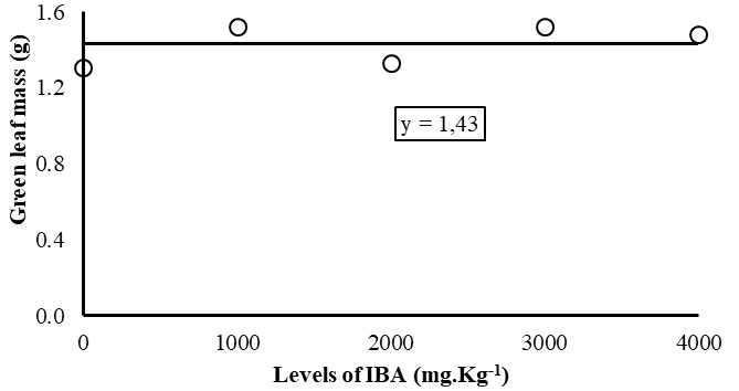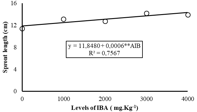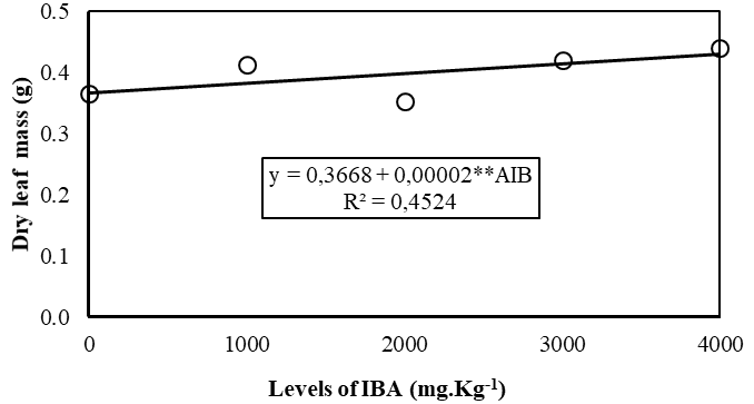The main phyto regulators involved in rooting are auxins and cytokinins that promote cell development by division; and the gibberellins that promote cell elongation, with the balance between the phytoregulators being the main factor responsible for the rhizogenesis in the cuttings.4 In this work the auxins did not act to improve the rooting of the cuttings, only the survival of the cuttings was significant and the variables related to sprout production were affected such as sprout length, number of leaves, and leaf dry mass.Auxins are hormones that also act in the emission of sprouts, in this work, probably the auxins used acted by stimulating sprouting since IBA showed improvements in the production of leaf mass.9 In research with IBA in guavas obtained positive results in the dosage of 2000 mg.L-1 of IBA, in the characteristics related to the rooting percentage, the number, the length, and the dry mass of roots in herbaceous cuttings of Psidium guajava L. 'Century XXI'.12