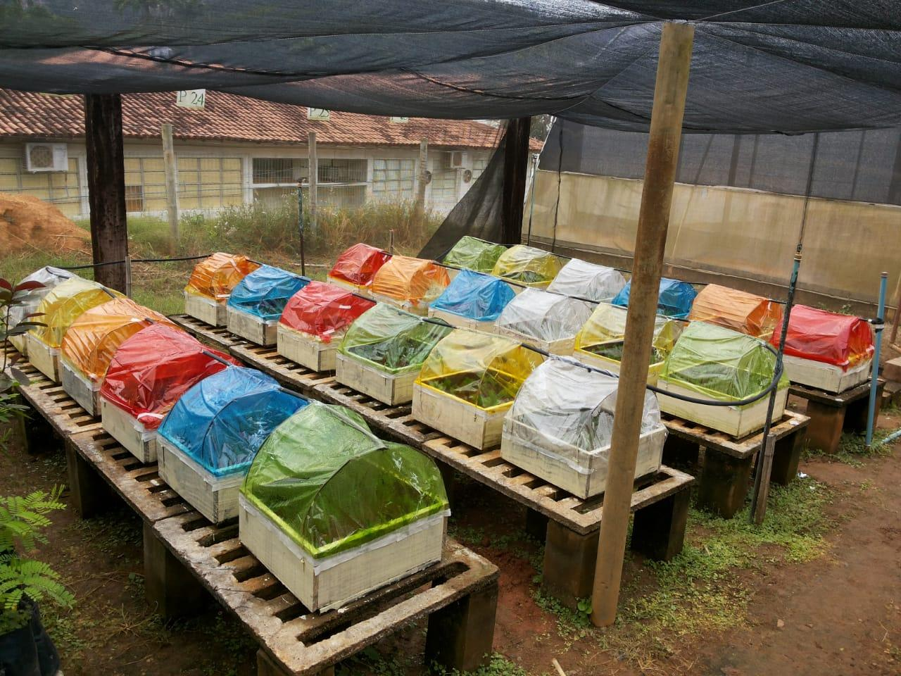 Herbaceous cuttings of guava from the cultivar “Paluma” were used as propagules in the experiment, obtained from non-lignified young branches. After preparing the propagules, the cuttings were immediately placed for rooting, in mini-greenhouses covered with cellophane of different colors: blue; green; yellow; orange; red; transparent, in polyolefin screen with 50% shading, in a randomized block design with six light quality treatments and five IBA treatments, 1.000 mg.Kg-1, 2.000 mg.Kg-1, 3.000 mg.Kg-1, 4.000 mg.Kg-1 and control without IBA, each with ten cuttings and four replications. The mini-greenhouses were made of wooden boxes, in the dimensions of 50x50x50cm containing substrate in the proportion of 3: 2: 1 (sand: soil: bioplant®), and irrigation with nebulizers, timed with the aid of a timer, being the irrigation done for 15 minutes every hour.