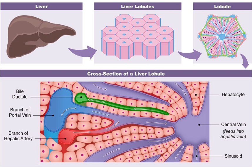 The liver is made up of small units called lobules, each of which contains sets of portal veins, hepatic arteries, and bile ducts (e.g. the portal triad).12. They are made up of cells called hepatocytes which have different roles based on their location in the lobule. Around the portal vein, hepatocytes function the most efficiently and regenerate first because they are close to the blood and nutrients. This region’s main function is oxidative metabolism. Hepatocytes that are farthest away from the portal triad have the lowest perfusion and play an important role in the detoxification of drugs and other molecules. Hepatocytes also create tubes that collect bile and facilitate the flow of bile out of the liver. Blood and bile flow in opposite directions with blood entering the liver and bile leaving the liver. The space of Disse is the area between the sinusoid and hepatocytes that contains various proteins.12 The hepatocytes contain microvilli that extend into this space to allow for proteins and nutrients from the blood and in the space to enter them. This space also contains macrophages, to clear out pathogens, and stellate cells, to store fat.12