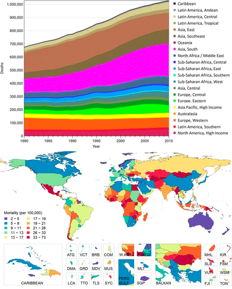 Figure 4 Worldwide statistics for liver-cirrhosis-associated deaths24 (A) Number of liver cirrhosis deaths from 1980 to 2010 globally. (B) Global distribution of age-adjusted liver cirrhosis mortality (per 100,000) in 2010.
