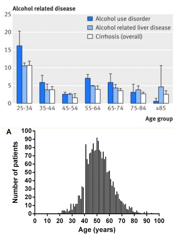 Liver cirrhosis is most common in people between the age of 45 and 64, with studies ranking it as the fourth leading cause of death for that age range (Figure 5). When combined with liver cancer, these two diseases account for 3.5% of deaths globally.20 The number of deaths reported among 45- to 64-year-olds increased from 16,746 in 198013 to 22,102 in 2018.21 From 1979 to 2008, the age at death decreased in people below 45 years by 14%, and deaths among people older than 75 years increased by 16%.13 While the incidence of cirrhosis in individuals between 25-44 is much lower compared to older age groups, a study showed the greatest change in yearly mortality for cirrhosis was in people aged 25-34; 10.5% during 2009-16, seen in Figure 5.1 This could be related to similar trends seen in alcohol use disorder and all alcohol-related liver disease deaths.1