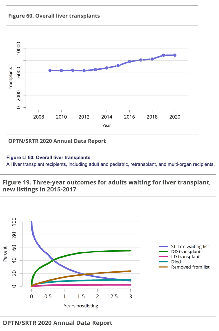 Doctors approach cirrhosis treatment by treating the primary disease since some of the diseases that cause cirrhosis can be cured.3 Many treatments include taking medicines and making lifestyle changes to help prevent further complications, but the only true “cure” for the disease is liver transplantation.3,4 Every year, roughly 25,000 liver transplants are performed with about a 90% 1-year survival rate, and about 8000-9000 in the U.S. with an 86% survival rate at 1 year.8,11 As seen in Figure 6A, the number of liver transplants being performed has steadily increased with higher rates after the COVID-19 pandemic.2 Mortality rates for patients among adult liver transplant recipients range between 5-20% depending on the procedure and patient demographics.2 With the success of liver transplantation comes the issue of a donor shortage in both children due to the scarcity of matched pediatric donors and in adults, because of the growing number of patients being added to the waitlist.8 In 2020, 24936 candidates were on the waitlist for liver transplant.2 In 2017, of the adults listed for a transplant, 58.0% received a transplant, 10.1% died, 23.4% were removed from the without receiving a transplant, and 5.8% were still waiting, as seen if Figure 6B.2