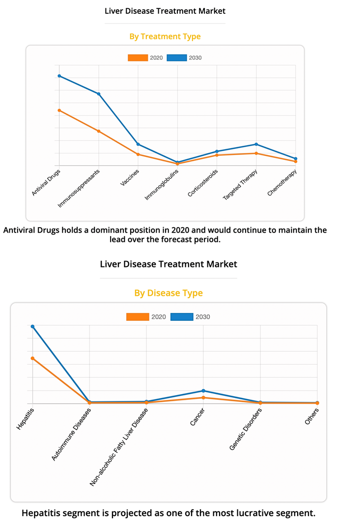 The cirrhosis treatment market can be divided based on the type of treatment, disease type, and region. Different treatments include antiviral drugs, immunosuppressants, vaccines, immunoglobulins, corticosteroids, targeted therapy, and chemotherapy drugs, as seen in Fig. 8A.23 Diseases classified as primary to cirrhosis include, hepatitis, autoimmune diseases, non-alcoholic fatty liver disease, cancer, genetic disorders, etc (Figure 8B).23