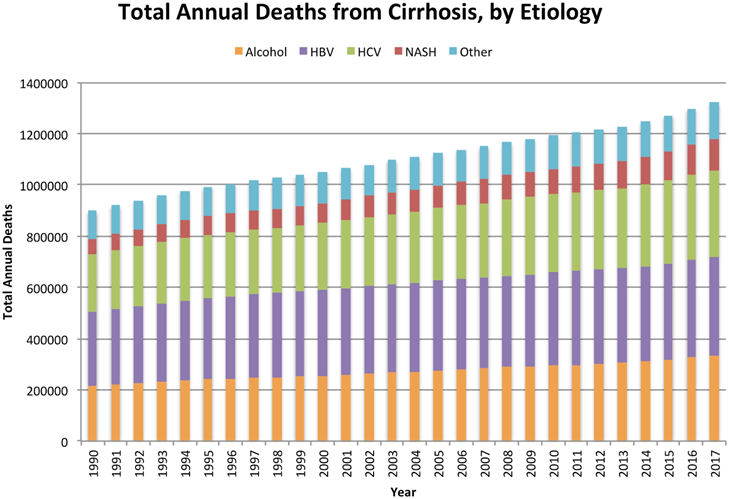 Figure 9 Total annual deaths from cirrhosis by etiology from 1990 to 2017 globally.5