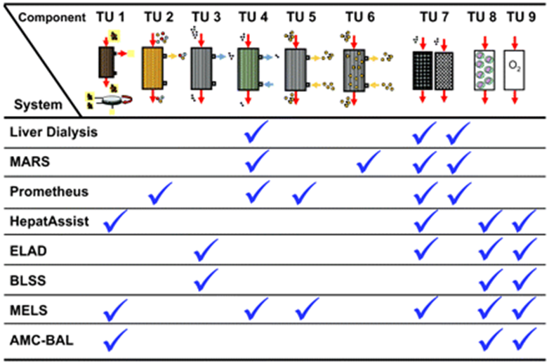 Figure 10 Summary of the treatment units integrated within each artificial or bioartificial liver support device.16
