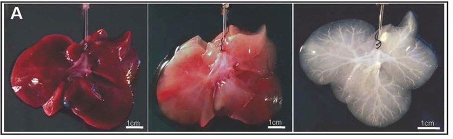 The first is the decellularization/recellularization approach. The principle liver tissue engineering materials should be derived from humans and decellularized organs can be used as a scaffold because of the specific mocrosctructure. Decellularization is the process of removing cells and other immunogenic factors from the liver so the natural scaffold remains (Figure 11). This is the only scaffold that completely preserves the complex vasculature and biliary system, which is extremely important when trying to derive a liver-like structure.5,30 Decellularized human livers have been recellularized with hepatic stellate cells, hepatocellular carcinoma, and hepatoblastoma cells.5 The decellularization process should not damage the ECM and, after recellularization, should be able to functionally mature in a perfusion bioreactor. A study completed in 2010 (Uygun et al.), used a murine model to successfully complete the first recellularization of an acellularized liver transplanted. The process allowed for adequate function of the implanted hepatocytes on the 3D scaffold.