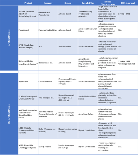 The goal of tissue engineering for the liver is the mimic normal liver functions, allowing for recovery and regeneration of the liver.24,27 This strategy can increase the chance of a waitlisted transplant patient receiving a compatible organ or completely prevent the need for a transplant. As explained above, the main reason for liver failure is the accumulation of toxins.5 As so, the main focus of researchers and manufacturer is the detoxification process. Artificial and bio-artificial extracorporeal devices are the main products being studied, both with significant advantages and disadvantages.