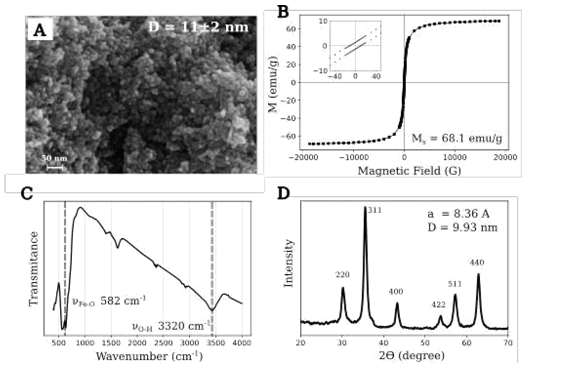 Synthesized iron nanoparticles are spherical (Figure 1A) with a medium diameter of 11±2 nm with a unimodal size distribution. The hysteresis loop of the Fe3O4 NPs is shown in Figure1B. The saturation magnetization (Ms) was 68.1 emu/g, a close value to that of bulk magnetite, indicating high superparamagnetic behaviour. The FTIR spectrum of the NPs (Figure 1C) exhibited the vibrational splitting-up peak at 551 and 582 cm-1 related to Fe-O bonds and attributed to magnetite octahedral and tetrahedral sites, respectively.29