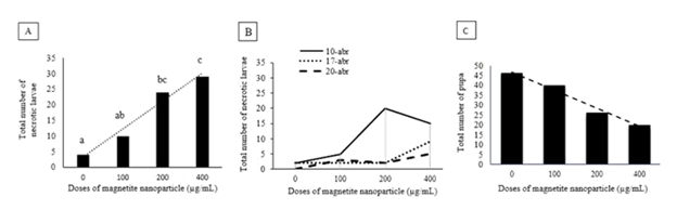 Figure 3 (A) Number of necrotic larvae under three different NPs suspensions (µg/mL): “0” is “control” *; (B) Number of necrotic larvae over doses of NPs measured in three different dates; (C) Total number of pupae under three different NPs suspensions. *Mean values followed by the same superscript letter are not significantly different (P > 0.05) by ANOVA Tukey's test.