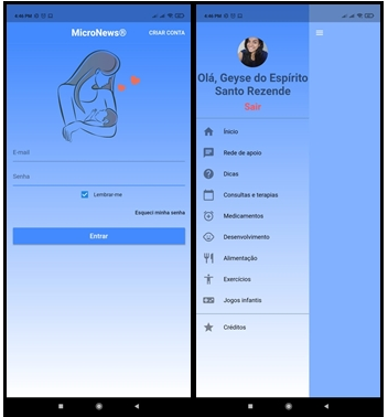 The MicroNews application was created with the aim of generating health education and managing daily care for children diagnosed with microcephaly by Zika Virus; has specific features for the needs of these children, so that it is possible to follow their evolution. When starting the application, the user is faced with the login screen, in which it is requested to create a new account, enter an existing account or recover the user's password. After logging in, the user can view a menu on the left side, giving access to the main functionalities of the application, as shown in Figure 1.