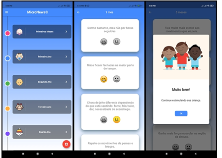 On the opening screen, a timeline with child development milestones organized by age was displayed, the first months being shown one by one, and from the first year onwards, organized every 3 months of life. These developmental milestones were based on normal child development, so that the knowledge of parents is expanded to the points that can be stimulated with greater intensity, as well as to assist in monitoring the child's progress.