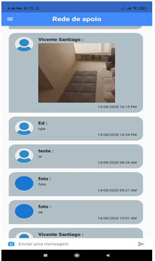 The Support Network comes as a resource to support users, with the freedom to exchange messages and photos between them, in a virtual and secure environment so that they can exchange information and tips with each other, making it possible to give and receive support. emotional. The messages are identified with the user's name and photo, as well as the day and time the message was sent, as can be seen in Figure 3.